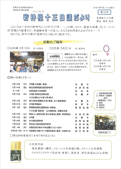 ・「若衆報恩講」の勤修、子供たちによる地蔵まつり及び夏休み期間中の読経体験など、親子一体となる姿で、より真宗土壌の醸成に努めること